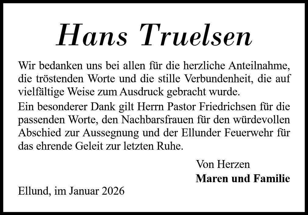 In trauriger Erinnerung an die vielen schönen Momente, die wir mit Dir und Gerda in Ellund bei Feuerwehr- und Nachbarschaftsfesten erlebt haben.