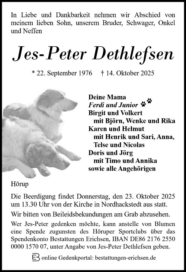 wir bekunden unser tiefes Beileid und nehmen Anteil an eurer Trauer über das viel zu frühe Ableben von Jes-Peter.