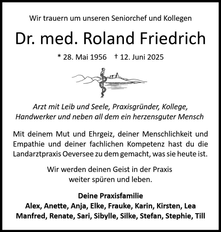 wir sind sehr betroffen von der Nachricht, dass unser Hausarzt R. Friedrich von uns gegangen ist. Unsere Familie war von Anfang an Patient bei ihm. Er hat uns immer sehr geholfen mit seinem Wissen und seiner ruhigen Art. Vor 20 Jahren hat er mir sehr geholfen, mit chinesischen Kräutern, dafür bin ich ihm heute noch dankbar.